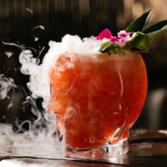 Served smoking with dry ice in a skull glass, that you get to KEEP.