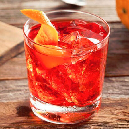 Shaken, not stirred over the rocks and garnished with an orange slice.